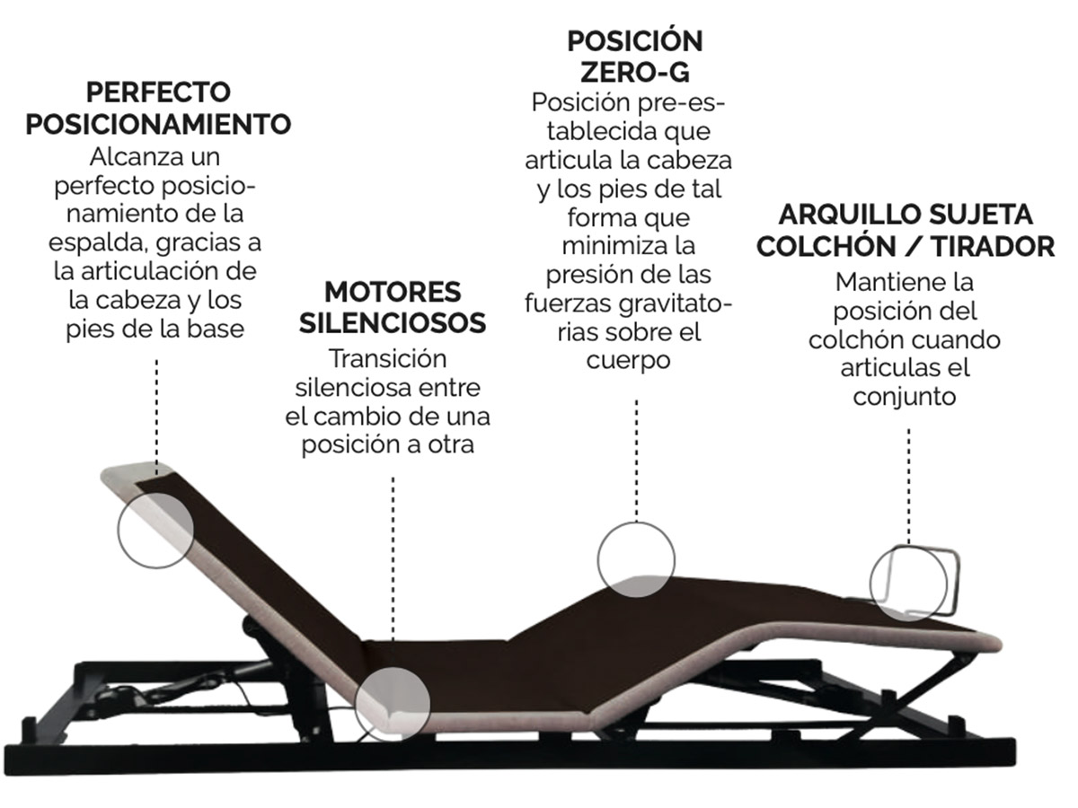 - Descanso más saludable: articulación eléctrica que ayuda a reducir ronquidos, apneas y reflujos gástricos.