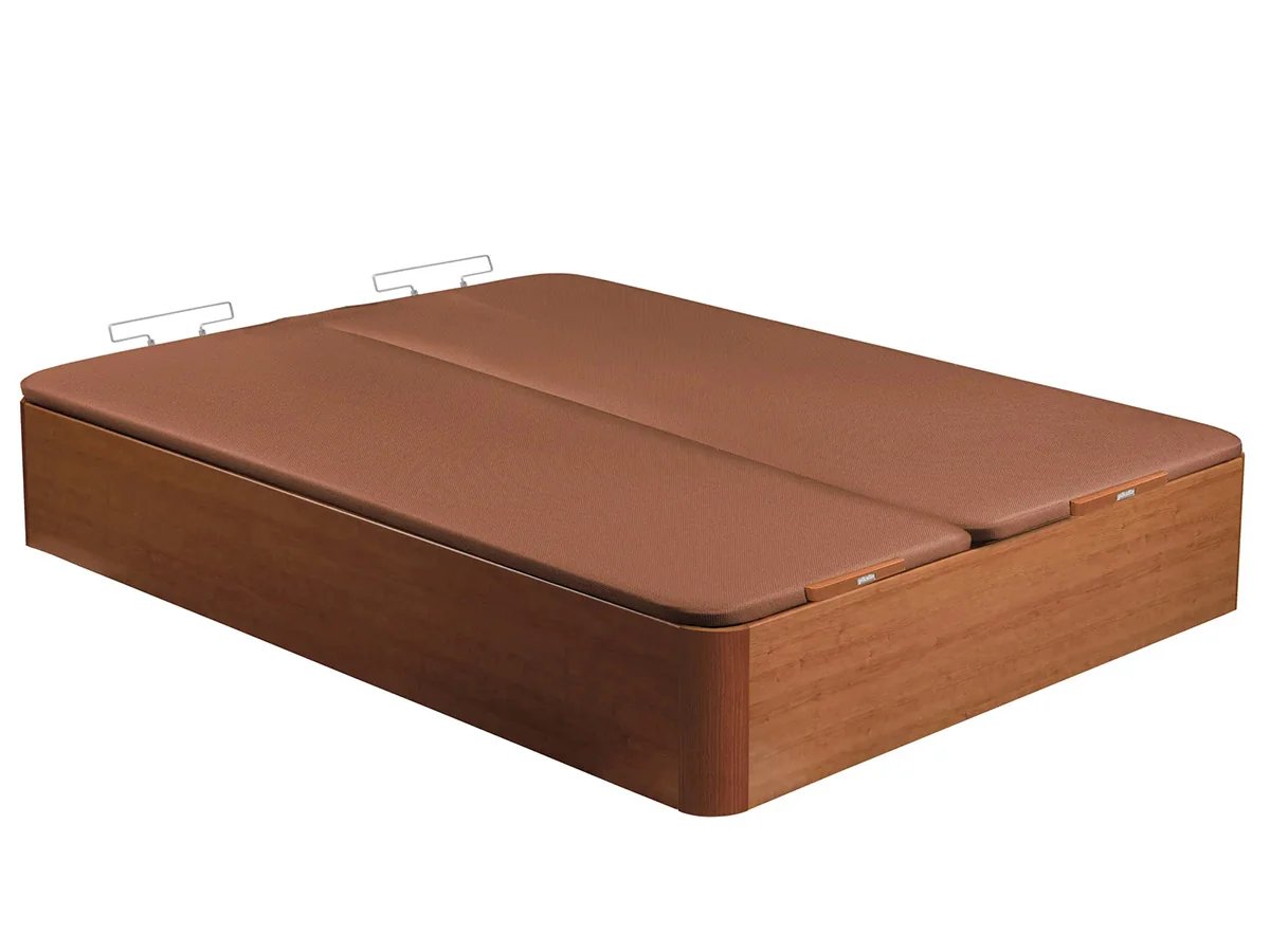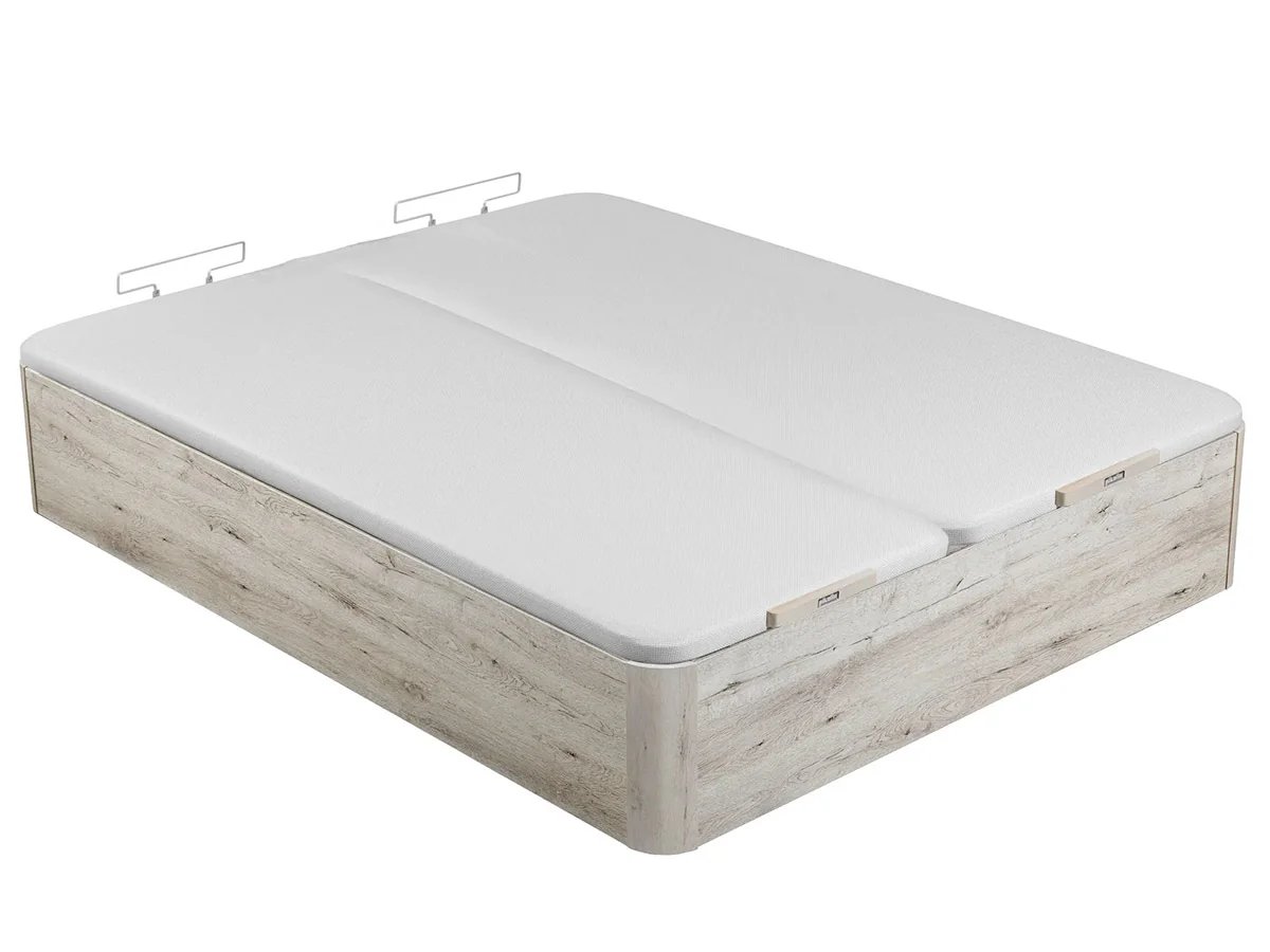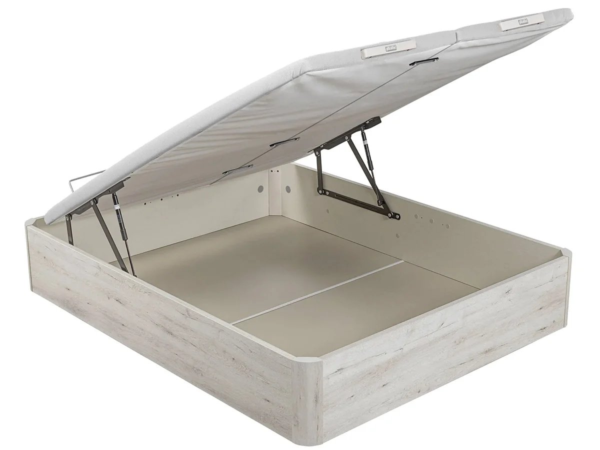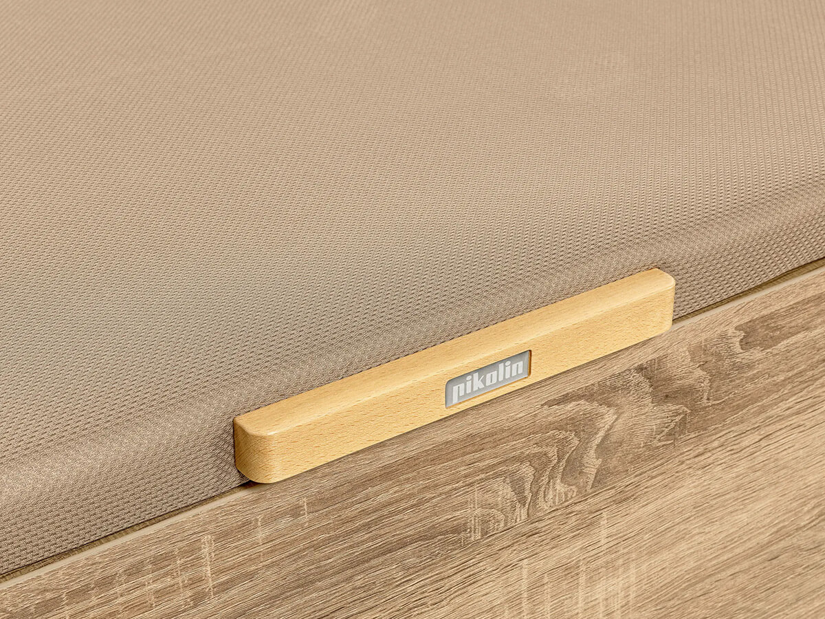 La apertura frontal se realiza mediante pistones de gas, integrados en el sistema de herrajes para proporcionar un movimiento suave, cómodo y silencioso. Además, incorpora tiradores de madera maciza y arquillo sujeta colchón para evitar desplazamientos cuando se abre la tapa.