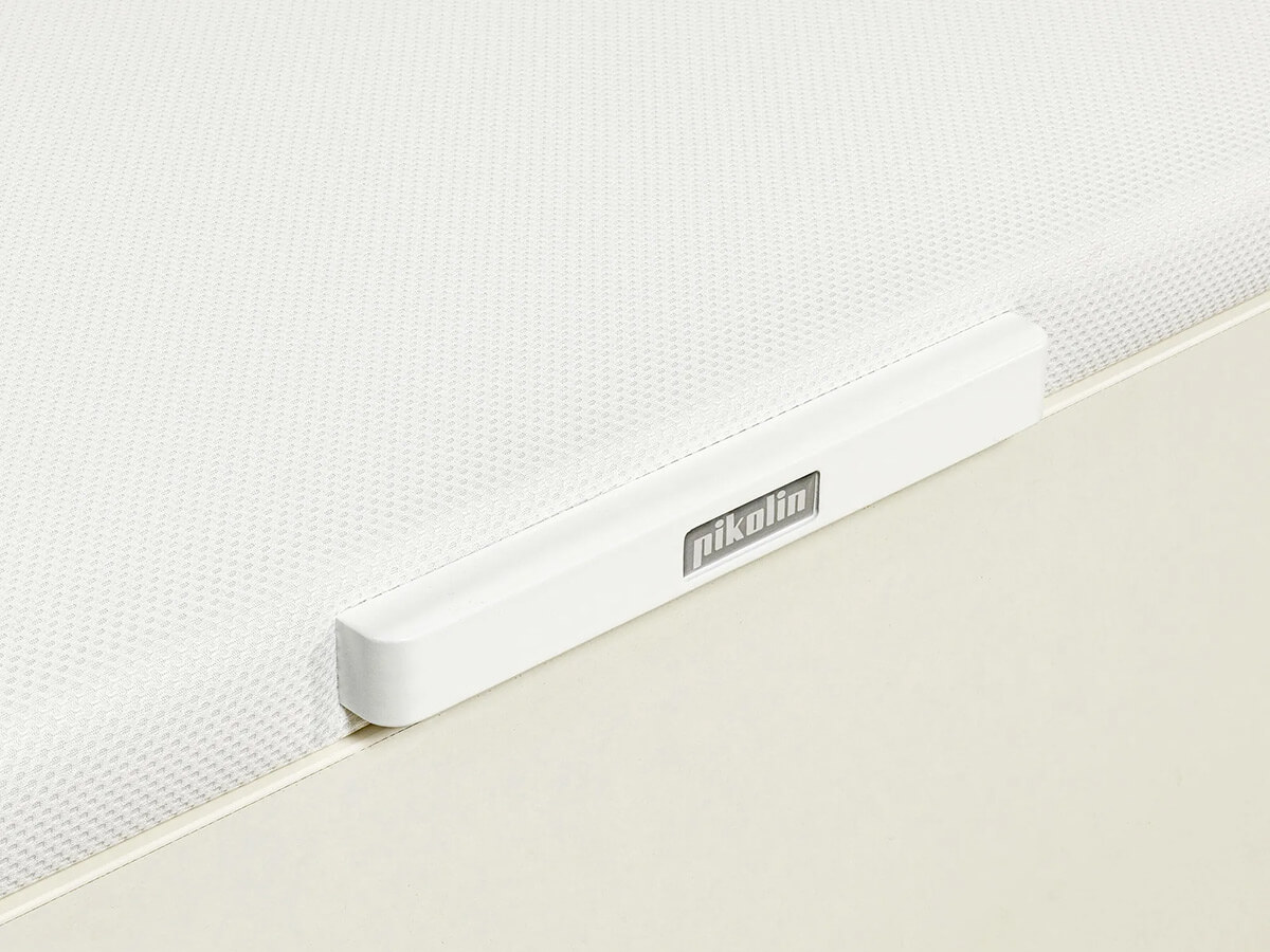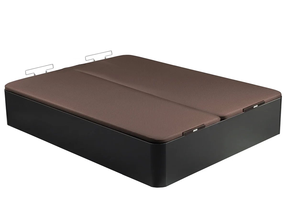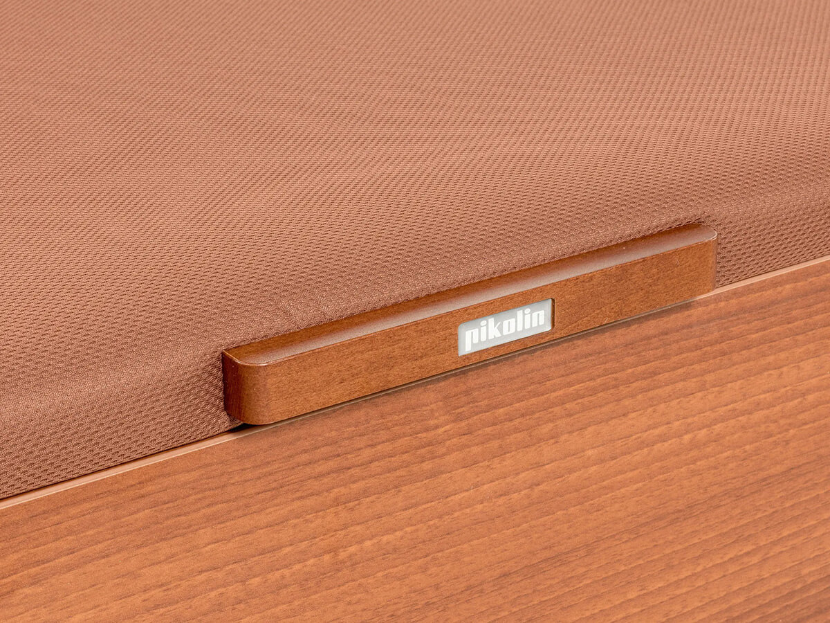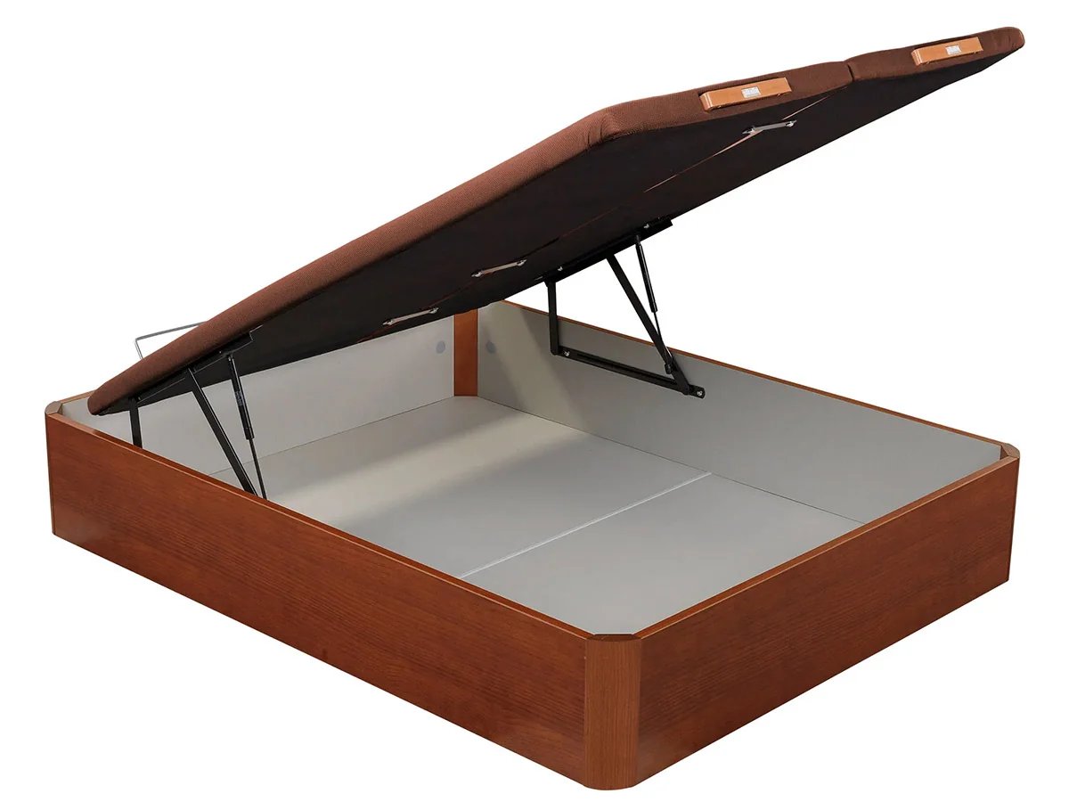 La apertura frontal se realiza mediante pistones de gas, integrados en el sistema de herrajes para proporcionar un movimiento suave, cómodo y silencioso. Además, incorpora tiradores de madera maciza y arquillo sujeta colchón para evitar desplazamientos cuando se abre la tapa.