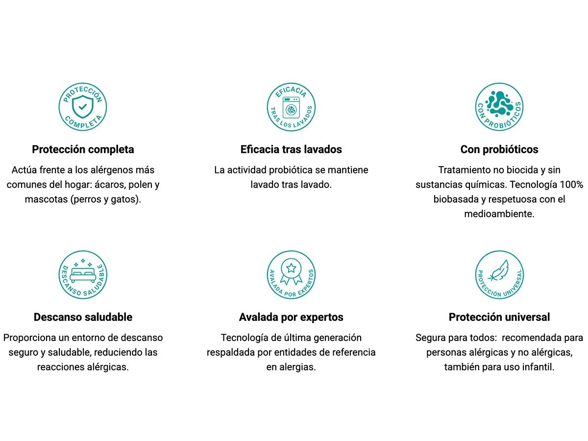 Durante su proceso de alimentación, los probióticos ayudan a descomponer los alérgenos presentes en el tejido. Por eso, este protector acolchado resulta especialmente atractivo para quienes buscan un producto de descanso con un enfoque más moderno, más amplio y más creíble que el simple concepto “antiácaros”.